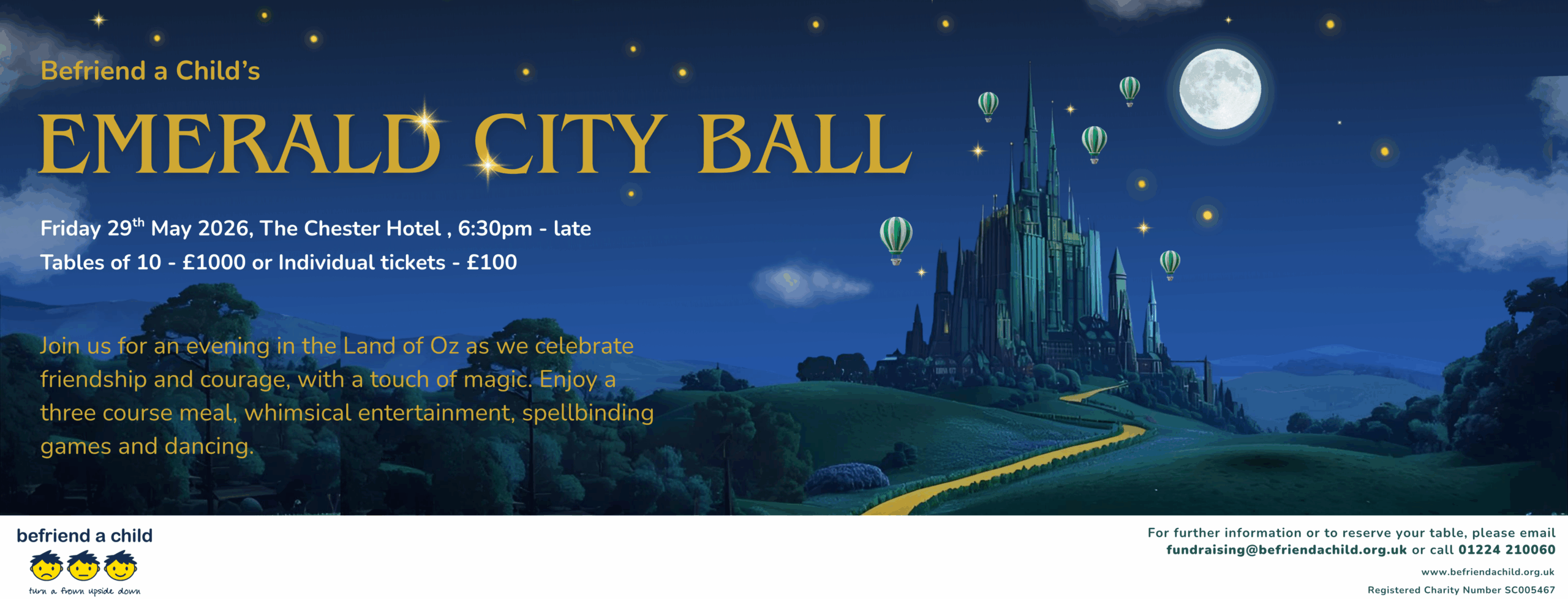 Follow the yellow brick road to a night of wonder at Befriend a Child’s Emerald City Ball. For one sparkling evening, The Chester Hotel will be transformed into a land of hope, heart and happiness — all to support local children and young people growing up in challenging circumstances across Aberdeen and Aberdeenshire.