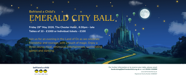 Follow the yellow brick road to a night of wonder at Befriend a Child’s Emerald City Ball. As you step into our Emerald City, your courage, kindness and heart will help us continue our vital work supporting children and young people across Aberdeen and Aberdeenshire who are growing up in challenging life circumstances.